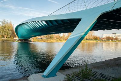 Tekst: Bourg-lès-Valence, une ville fluviale coupée du Rhône depuis la construction de l'A7 en 1965 – connue sous le nom de 'route de soleil' –, a constamment cherché à rétablir le contact avec le fleuve. La 'Passerelle Bleue', construite en 1989, n'offrait toutefois pas la liaison souhaitée à cause de sa difficile accessibilité. Le nouveau pont piétonnier vers le quartier 'l'île Girodet' a été conçu pour remédier à cela et s'inscrit dans un nouveau plan directeur. La ville a demandé un pont qui relie l'île à la ville, renforce le plan de circulation tout en tenant compte de la piste cyclable Via Rhôna, sans pour autant nuire à l'attrait et à l'expérience du parcours. Le souhait de maintenir la hauteur de la passerelle aussi basse que possible et de minimiser les pentes du côté du Quai Barjon a conduit à l'utilisation d'une structure porteuse élevée au-dessus du tablier. Même si plusieurs types de ponts peuvent convenir pour une portée d'environ 60 m, le recours à un pont à haubans ou à une structure suspendue mono-pylône permet de créer un signal visuel fort. Telle est la réponse à la demande du maître d'ouvrage. Le pont piétonnier est un pont à haubans asymétrique avec un pylône central articulé. La construction est intégrale, c'est-à-dire qu'elle est solidement reliée à la fondation. La dilatation thermique est compensée par le déplacement transversal de la construction, rendu possible par la forme prévue. Le tablier et le mât sont entièrement en acier S355, à l'exception du palier du mât, qui est en acier forgé S325G. Le tablier est constitué d'une poutre caisson rectangulaire creuse, constante sur toute la longueur de la structure, avec une plaque supérieure renforcée longitudinalement de 400 mm. La partie pylône est un tube d’acier creux de diamètre variable. Les haubans sont constitués de câbles entièrement verrouillés qui ont été protégés contre la corrosion en atelier par galvanisation, puis par un revêtement riche en zinc sur place. La passerelle piétonne devient le symbole de la reconstruction du quartier 'l'île Girodet'. Elle est également le point de repère qui invite les gens à traverser le pont.