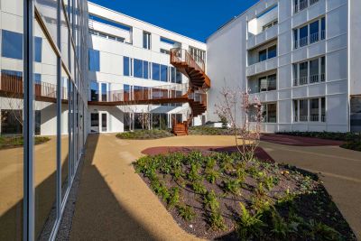 Tekst: Le projet de réhabilitation lourde (démolition, reconstruction complète tout en conservant les façades) d’un îlot situé rue Madeleine à Liège comprend la création d’un patio végétalisé couvrant un parking. Ce lieu central du projet nécessite la création de connexions verticales. Un escalier hélicoïdal en acier auto-patinable dessert 2 passerelles de connections distribuant les étages supérieurs. Structurellement, le souhait est de limiter les appuis et autres contraintes qui parasitent la lecture de l’objet. L’escalier est composé d’un unique limon central porteur (caisson constitué de tôle de 20 mm) et de marches (de 8 mm) en porte-à-faux. Les tôles constitutives du limon sont fortement gauches (non développables) nécessitant un grand savoir-faire dans la mise en force de ces tôles. Ce caisson est le seul élément structurel de l’escalier qui doit également reprendre les charges des passerelles qui s’y connectent. La disposition des passerelles permet de créer un ensemble équilibré sur 3 appuis révélant le savoir-faire historique des chaudronniers. Les passerelles sont des caissons en acier trapézoïdaux à section variable de 30 cm de hauteur. L’utilisation de l’acier permettait ici de réaliser une structure légère et élégante, facilement transportable en cœur d’ilot.