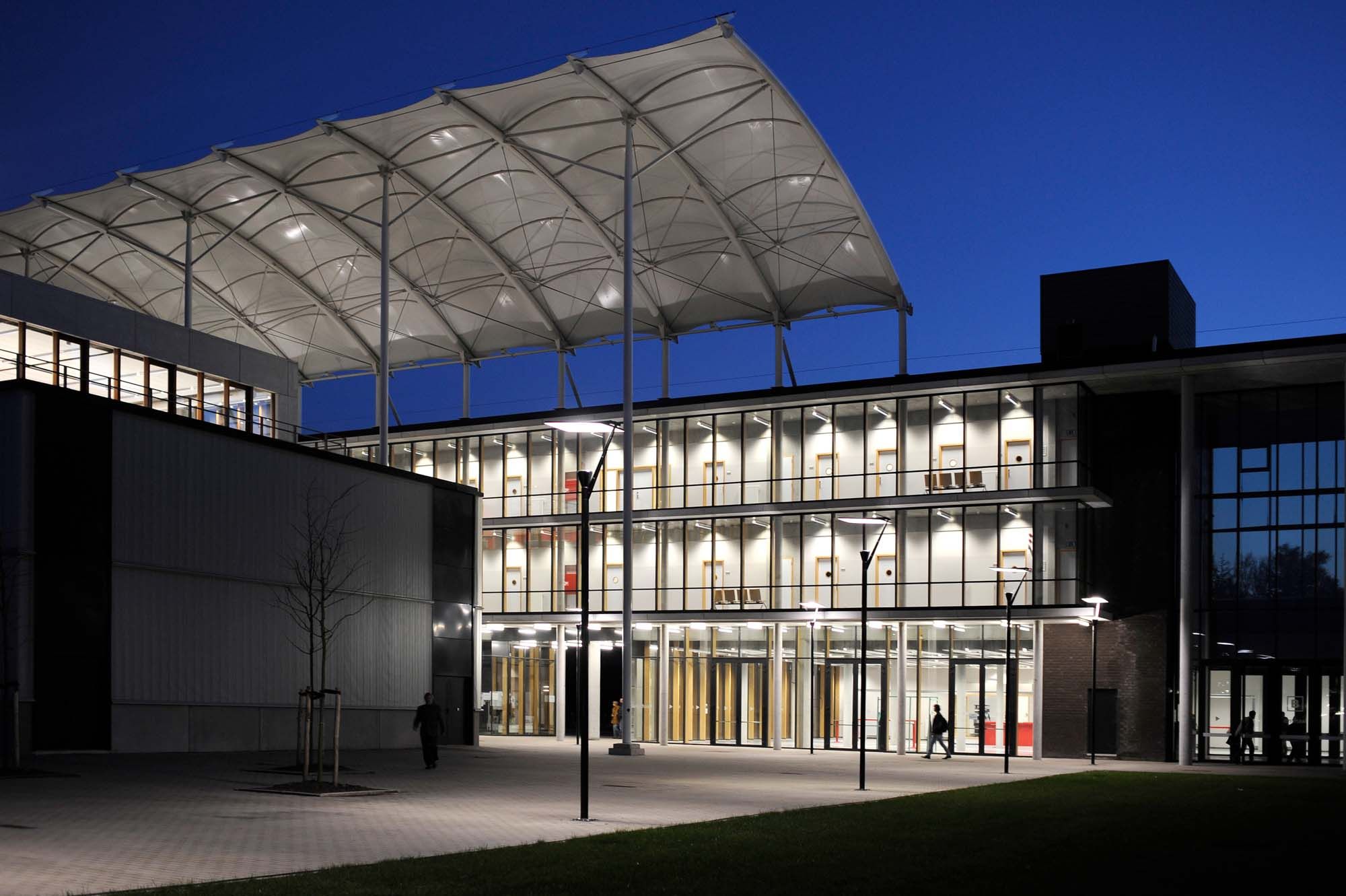 Le nouveau bâtiment de l’Open Leercentrum (Centre d’apprentissage ouvert) a été implanté sur les principaux axes piétons du campus, et remplit ainsi sa fonction de centralisation. Il est constitué de deux volumes bâtis reliés par trois volumes de circulation. L’espace extérieur entre ces bâtiments est couvert d’un auvent en fibres de polyester recouvert de PVC sur une structure en acier élancée. La couverture est une structure mixte acier-membrane strictement modulaire. Elle est constituée de 28 travées de 4,80 m de large et de 14 m de long. Une toile est tendue en travers du bâtiment entre deux arcs principaux parallèles. Des arcs secondaires transversaux, dont la flèche est de 0,75 m pour une portée de 4,80 m, sont placés sur les arcs principaux. La toile tendue entre les arcs secondaires a donc la forme d’une selle.