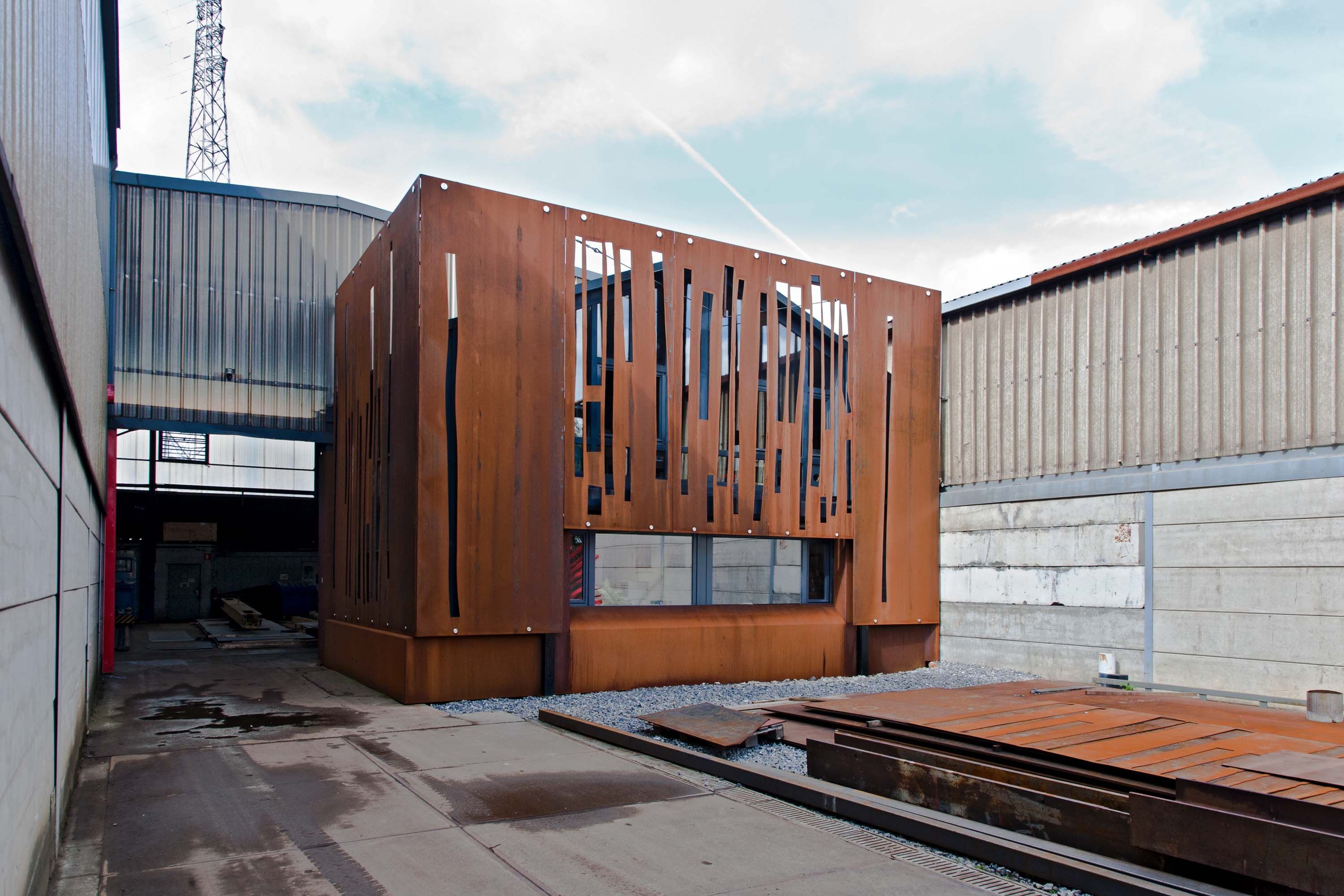 Pour le projet présenté ici, les ateliers Melens et Dejardin ont commandé à l'architecte la conception d’une transformation et la requalification d’un espace de bureau, à mettre en œuvre (conception et exécution) en moins de deux mois. La conception s’inspire de ce que la tôlerie peut apporter comme solutions techniques en matière de construction. La feuille d’acier est utilisée à la manière d’un drap tendu sur un fil à linge et suspendu à des "pinces". La tension est bloquée au niveau inférieur. Les «pinces à linge» sont réalisées spécifiquement pour le projet sous la forme de boulons alésés de grand gabarit. La tôlerie est en acier Corten pour ne pas nécessiter de traitement ultérieur. Les feuilles de façade sont découpées selon les contingences intérieures des bureaux : vues, lumière et aération.  Après numérisation, la découpe finale a été testée sur tôle mince à l’oxydodécoupeuse. Le résultat final devait exprimer les compétences nouvelles de l’entreprise.