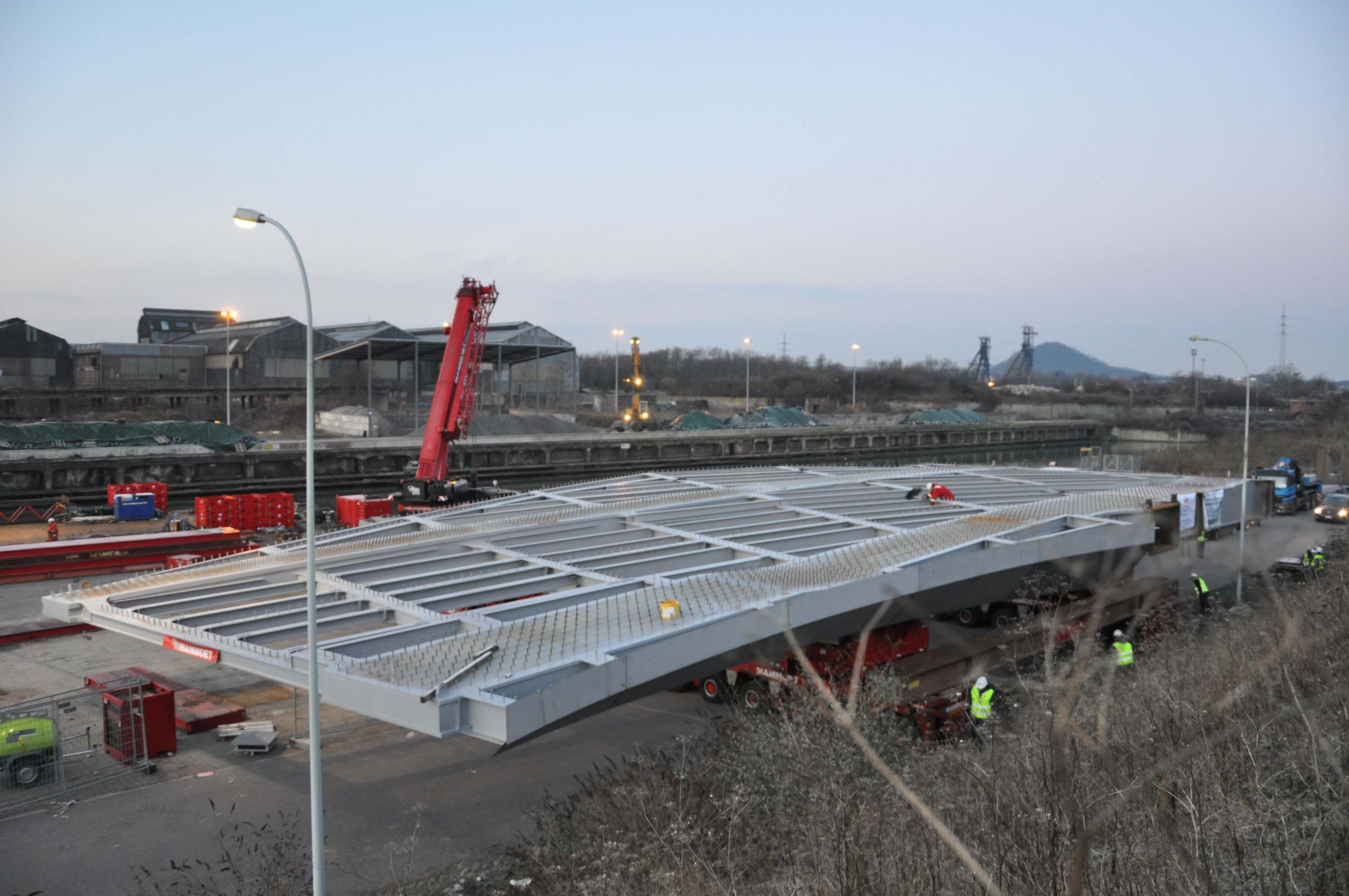 Les travaux d’extension du Métro Léger de Charleroi ont pris fin en 2012. Dans la boucle Sud, le tram sortira de la station et traversera la Sambre, via un nouveau pont courbe partiellement planté.  La conception du pont est particulièrement complexe. Sa portée est de 53 m, son poids est de 1060 Tonnes dont 500 tonnes de structures métalliques. L’ouvrage est composé de 3 caissons droits, d’entretoises métalliques, et d’une dalle collaborante en béton armé.  Les difficultés rencontrées lors de l’étude sont les conséquences de la géométrie du pont et des sollicitations présentes : courbure, dévers, différences de niveaux entre les deux quais, porte-à-faux, phénomènes dus à la fatigue, appuis sur des quais en porte-à-faux via une dalle souple.