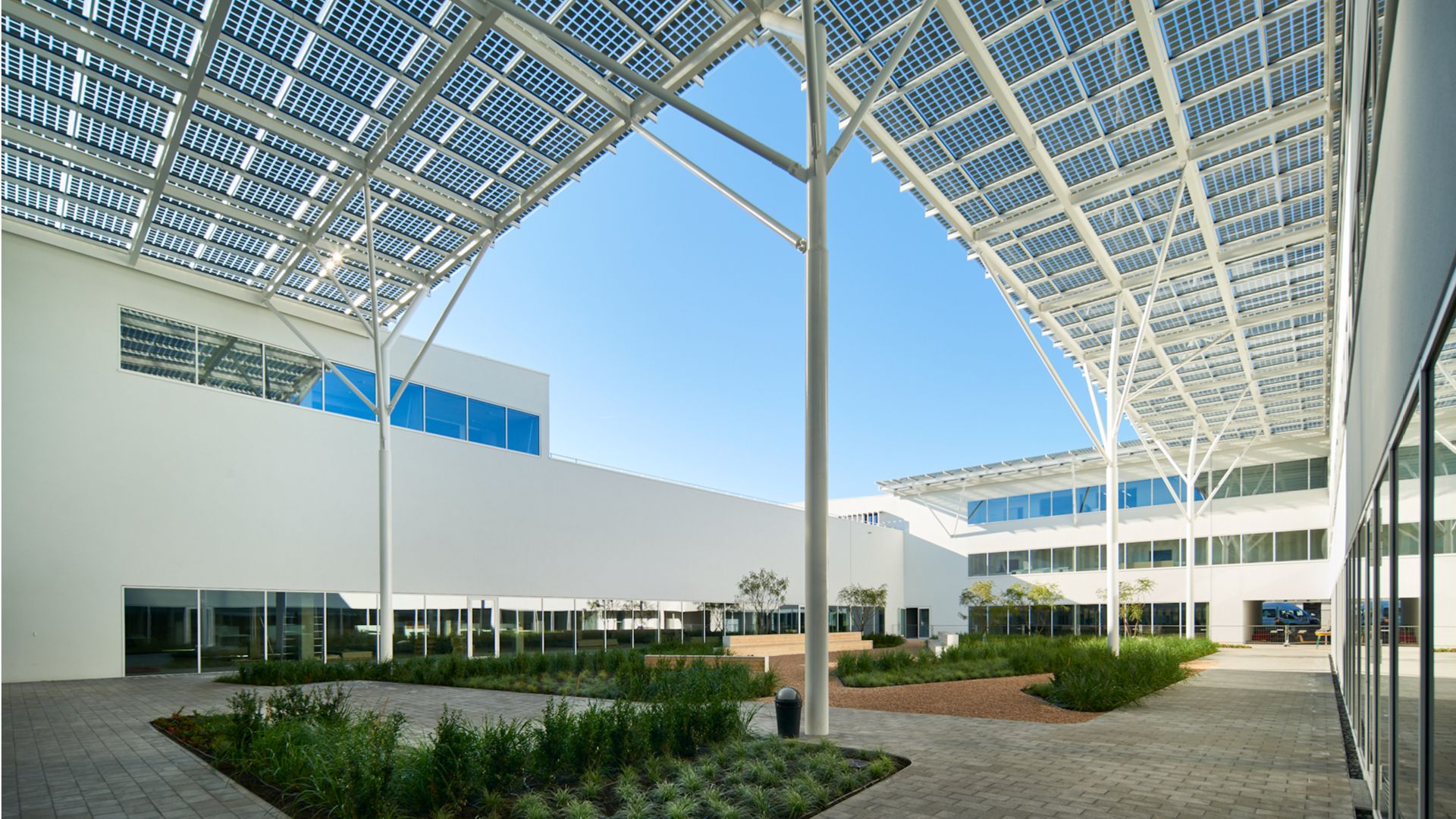 Les canopées photovoltaïques sont réalisées en acier et composées 'd’arbres' d’une hauteur de 18 m et d’une résille métallique en guise de support des panneaux photovoltaïques. L’utilisation d’un logiciel de calcul paramétrique a permis d’optimiser la forme géométrique des arbres métalliques supportant les canopées, et donc de minimiser la quantité de matière mise en œuvre, tout en respectant le désire de structure 'organique' de l’architecte.