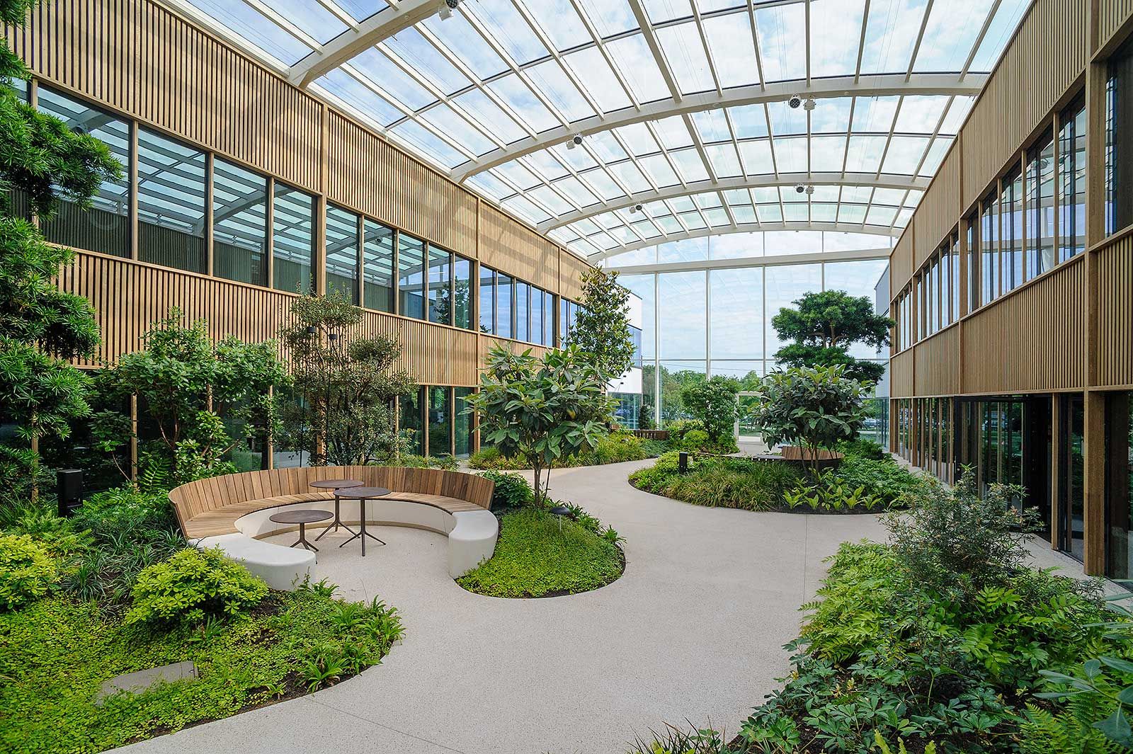 Une verrière bioclimatique composée de poutres cintrées