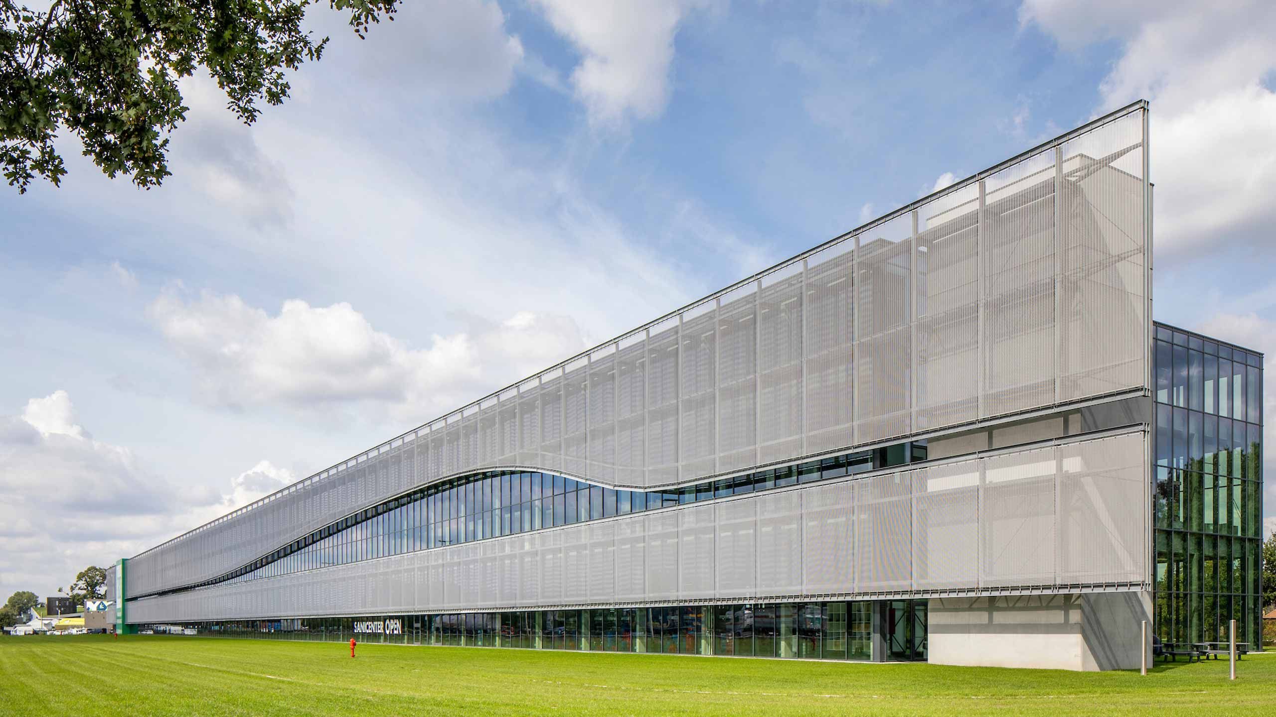 Een façade van maar liefst 300 m lang, pal naast de drukke E40: geen wonder dat de nieuwe Vlaamse vestiging van FACQ sterk in het oog springt. Zeker omdat er sprake is van een langgerekte vliesgevel met een licht golvende inoxbekleding, die het geheel een ultrastrakke, dynamische uitstraling geeft. De gesloten gevelpartij met het karakteristieke groen-witte bedrijfslogo maakt het plaatje compleet.